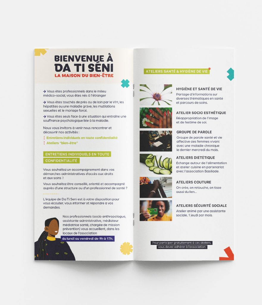 Ce dépliant présente l’ensemble des actions menées par Da Ti Séni à Lyon : médiation santé, ateliers santé et hygiène de vie, groupes de parole, accompagnement administratif, ainsi que les modalités pour participer aux activités, adhérer à l’association ou s’engager comme bénévole ou donateur.